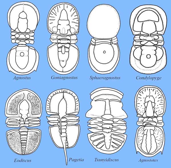 Überfamilie Agnostoidea: Acadagnostus, Agnostus, Ammagnostus, Arthrorhachis, Aspidagnostus, Axagnostus, Clavagnostus, Cotalagnostus, Diplagnostus, Geragnostus, Grandagnostus,