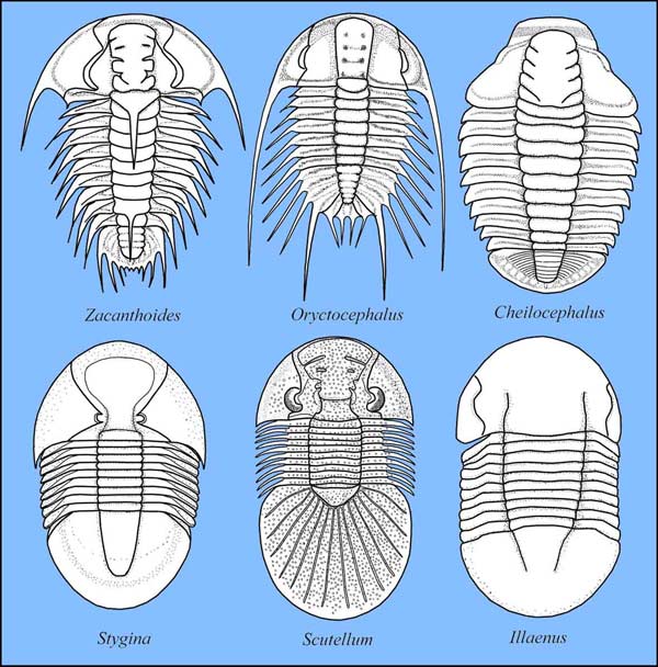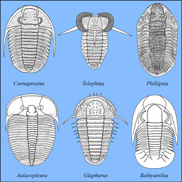 - Pygidium: gewöhnlich groß, in etwa so groß wie Cranidium oder nur wenig kleiner bzw. größer, im Umriß stark variabel, z.T. bestachelt
